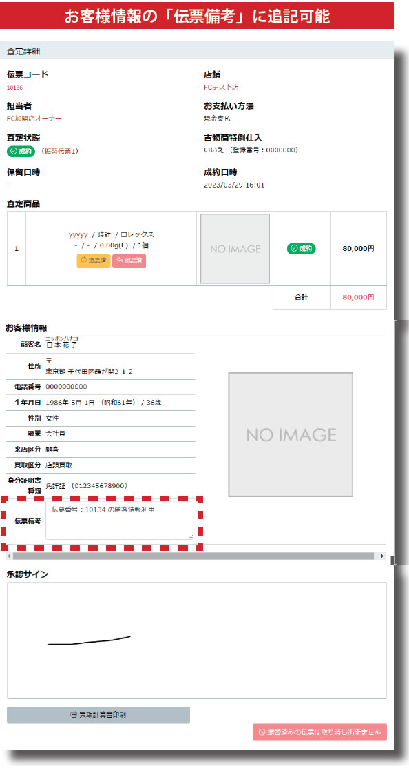 左側メニュー「査定履歴」画面を開いて、該当する商品の「詳細」から「お客様情報」欄の一番下に「伝票備考」欄がありますので、こちらに追記することが可能です。