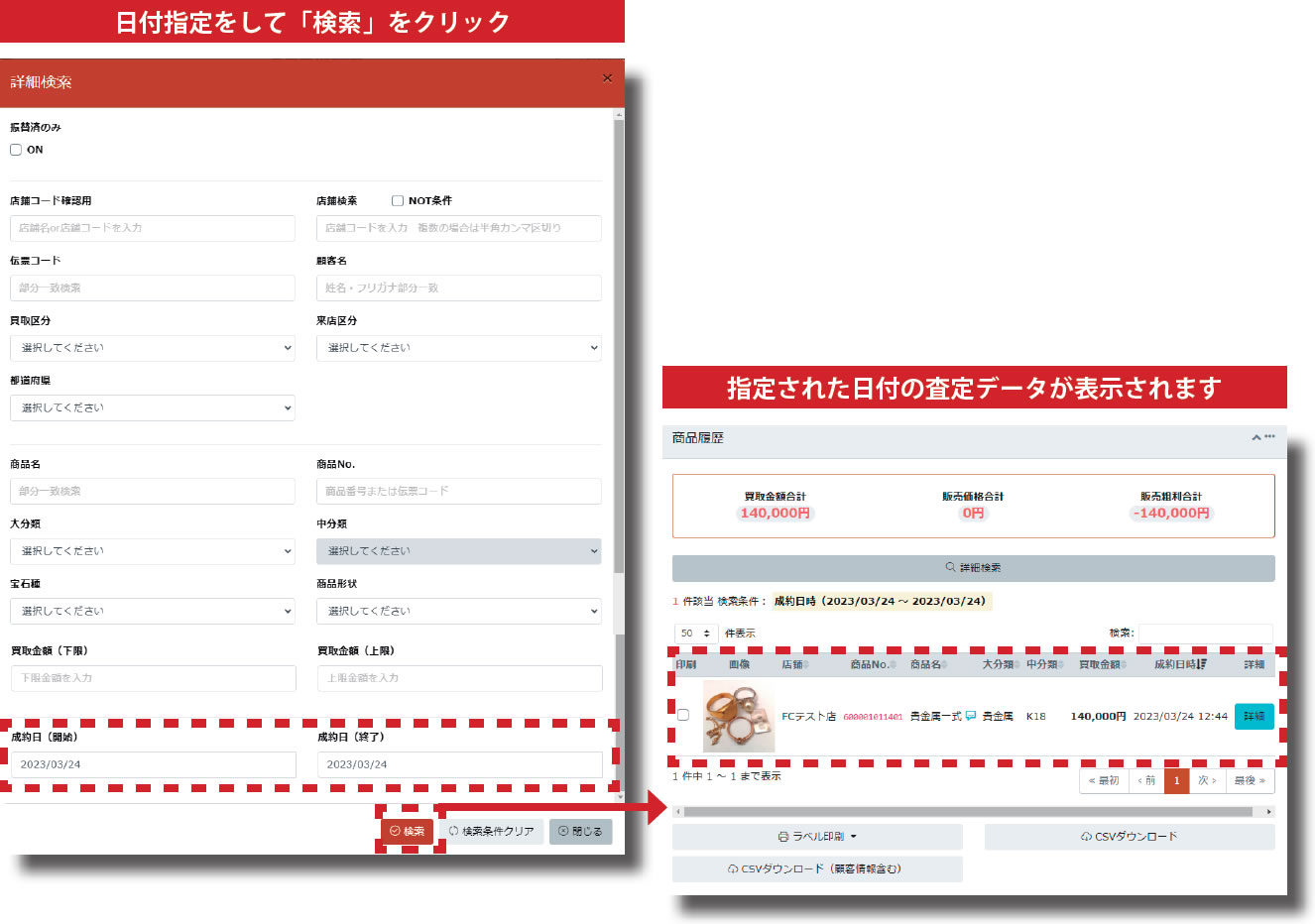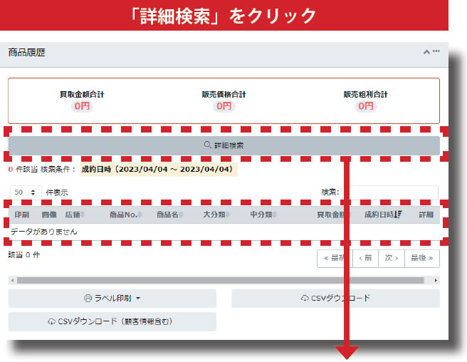 「詳細検索」をクリックして「成約日」で確認したい商品データの成約日付を指定して「検索」をすることで、商品履歴が表示されます。