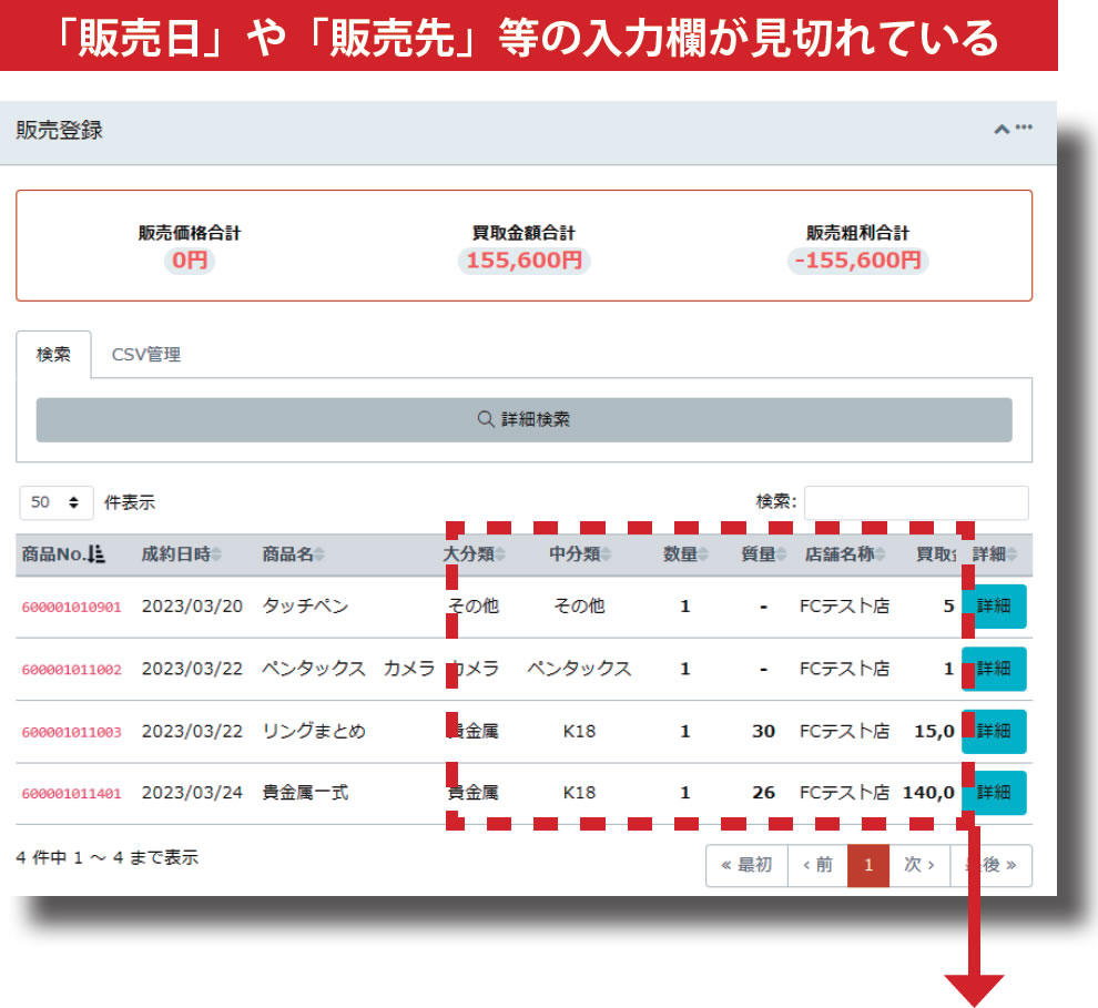 この一覧は表示項目が多いため、画面サイズによっては「販売日」や「販売先」等の入力欄が見切れていることがあります。