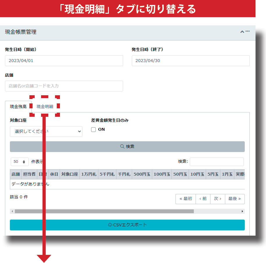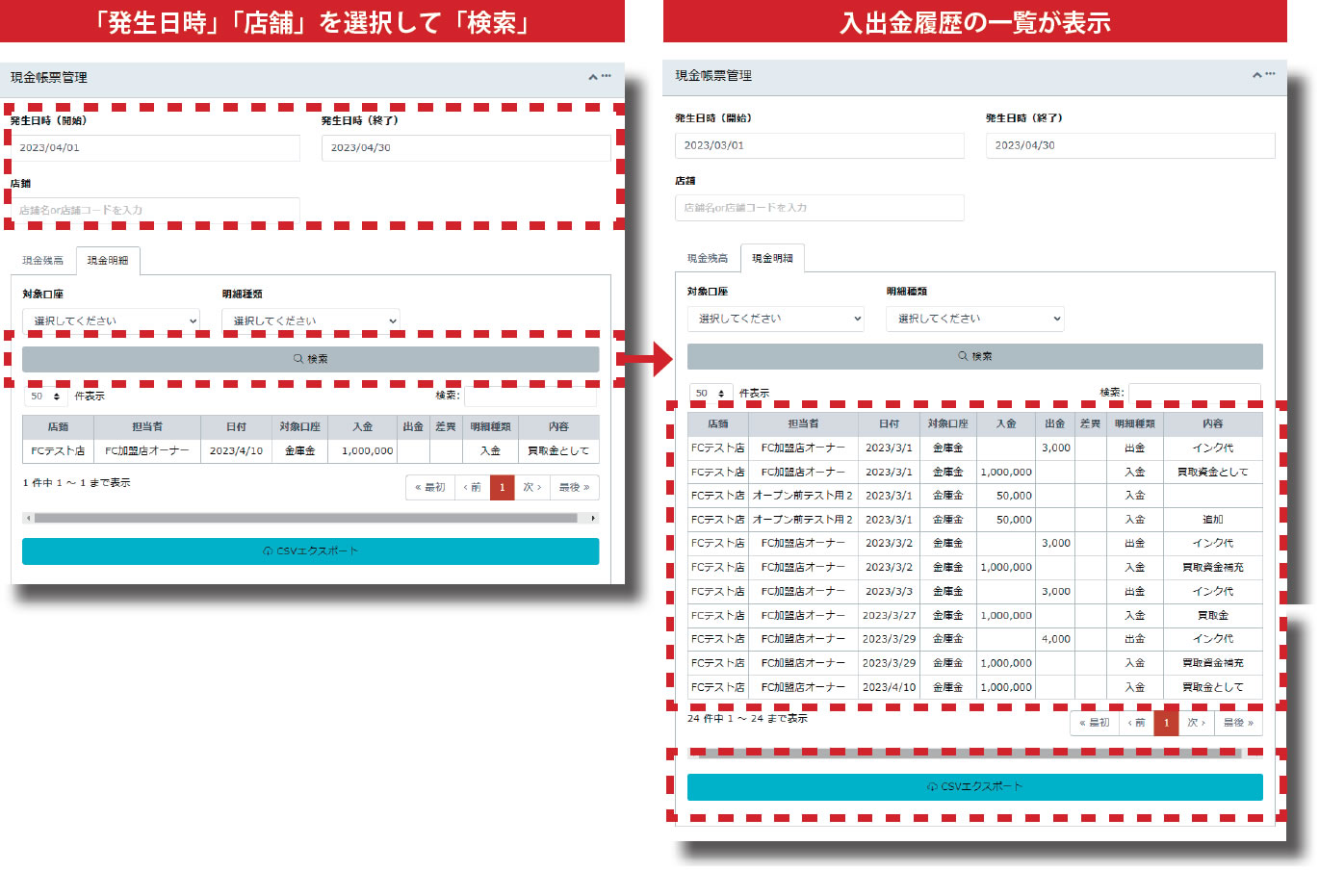 左側メニュー「現金管理」>「現金帳票管理」画面を開いて、「現金明細」タブに切り替えて「発生日時(開始)」、「発生日時(終了)」「店舗」を選択して検索すると表示されます。