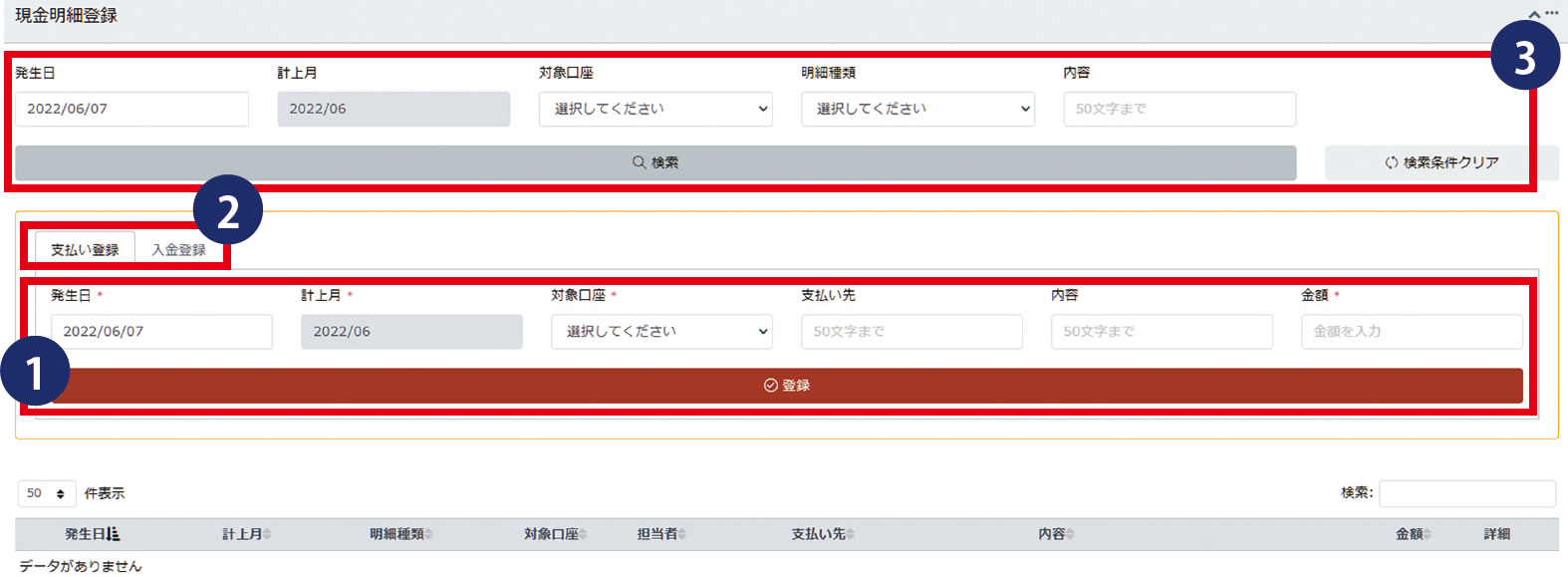 「現金出納帳」画面では、入金、出金、残高等の確認ができます。