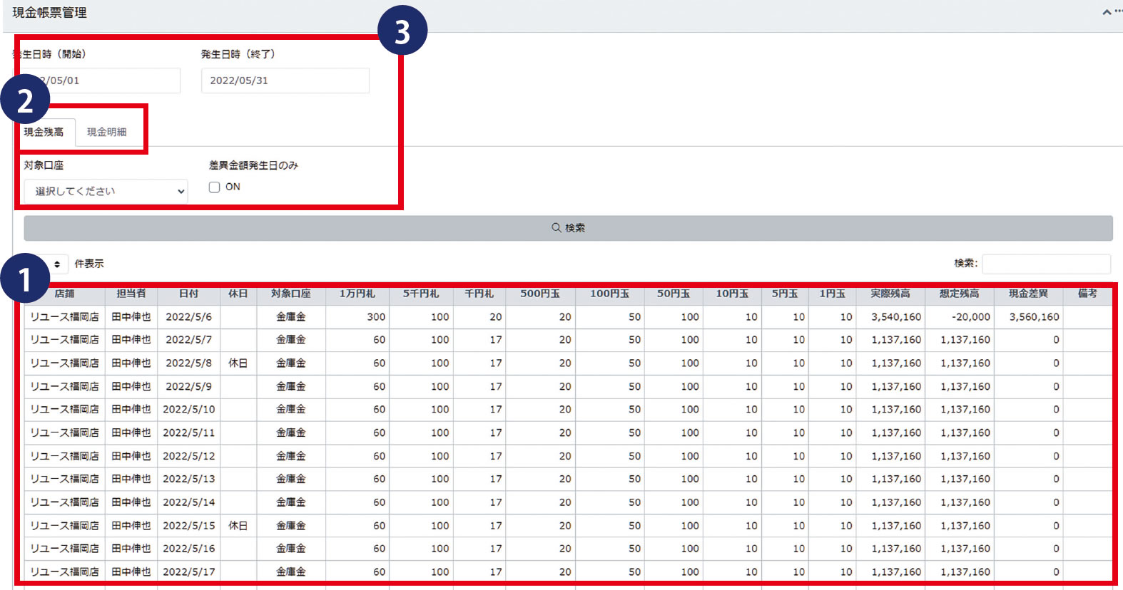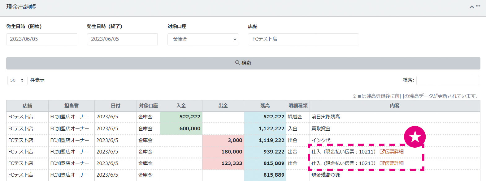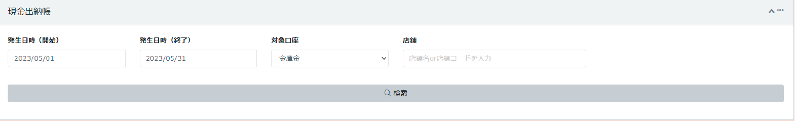 「発生日時」「対象口座」「店舗」を選択して「検索」をクリックすると、指定した現金出納帳が表示されます。