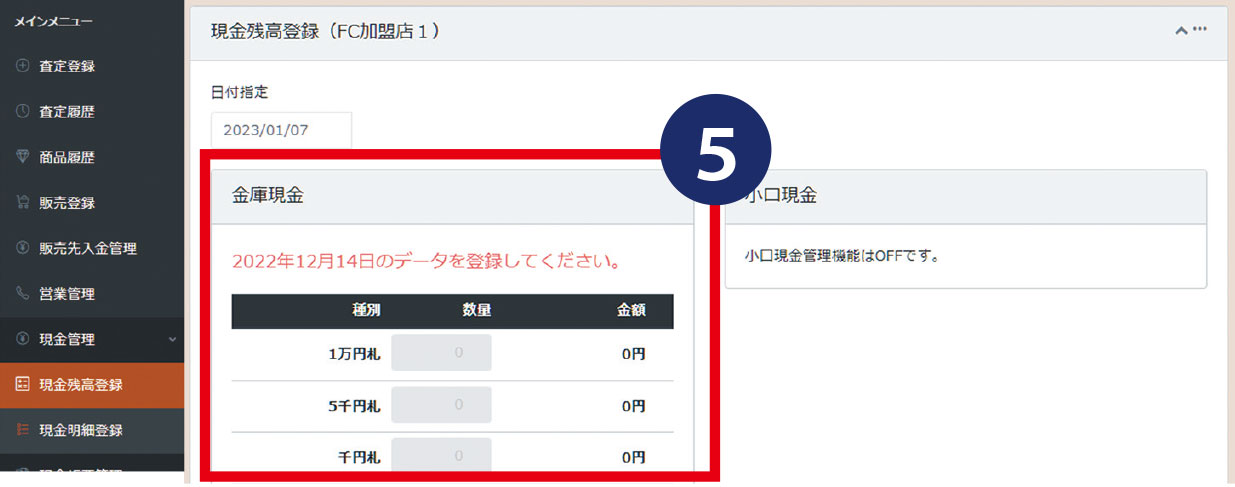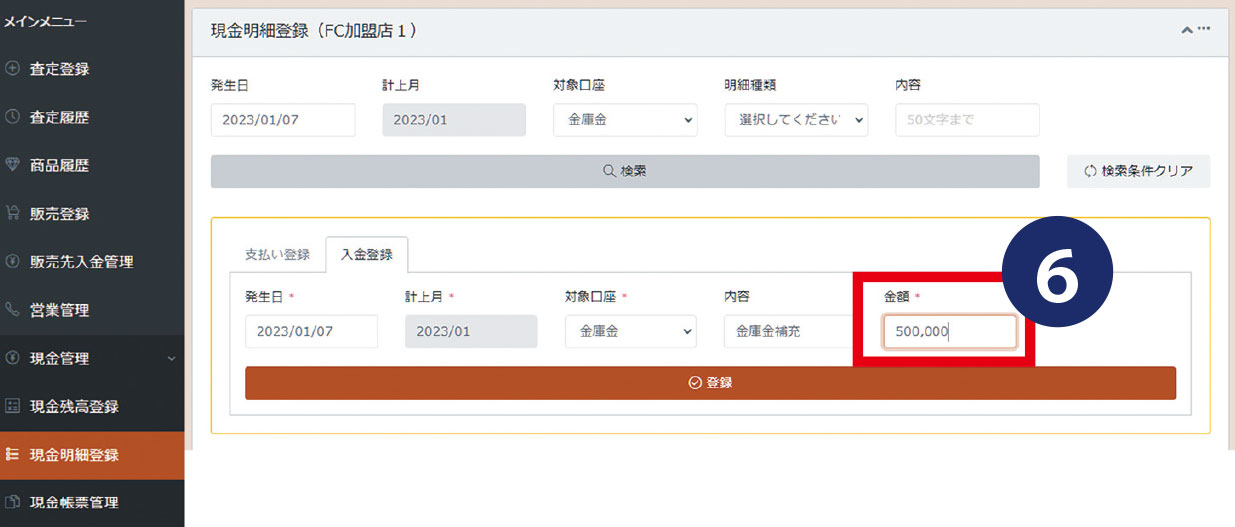 6金庫金を補充するときは、「現金管理 > 現金明細登録」画面で「入金登録」タブに切り替えて、入金金額を入力して「登録」をクリックしてください。