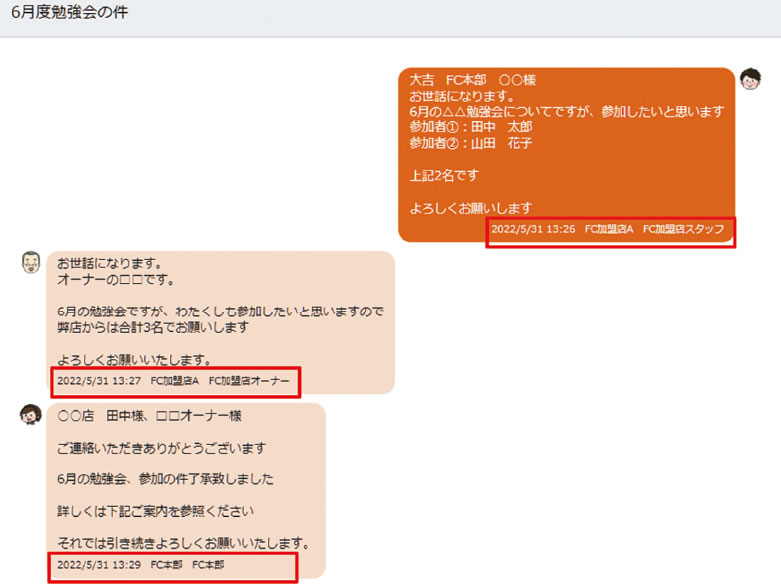 店舗とFC 本部様とのメッセージのやり取りができます やり取り可能なパターンとして ① 店舗スタッフ様 + オーナー様 + FC 本部スタッフ の3 者間チャット。 ② オーナー様 + FC 本部スタッフ の2 者間チャット。 の2 パターンあります オーナー様は店舗スタッフ様とFC 本部のスタッフとのやり取りをチェック可能です また、店舗スタッフには開示しない内容であればオーナー様とFC 本部スタッフ様だけのやり取りも可能です。