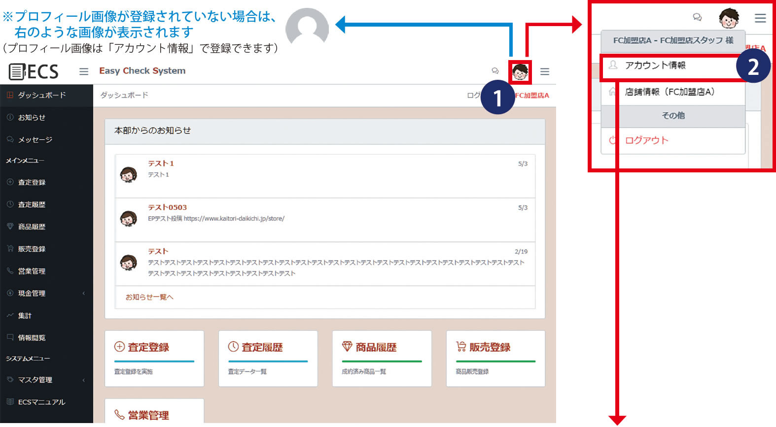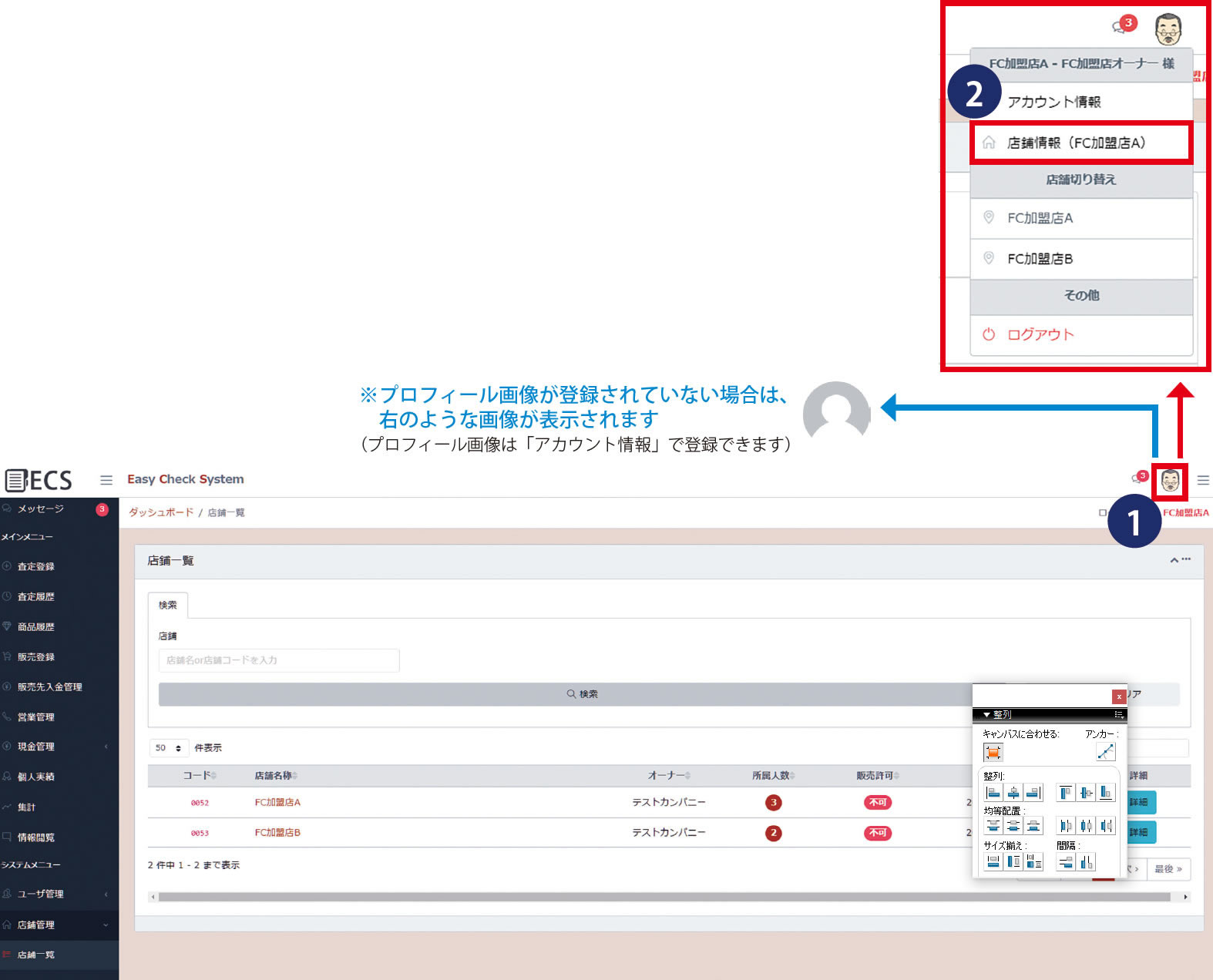オーナー様は発行されたID・パスワードでECS にログインして、店舗詳細情報の登録、販売先の登録、店舗スタッフ様の登録をお願いいたします。