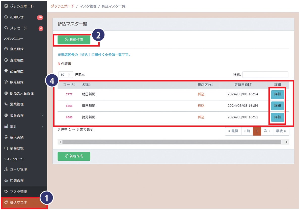 「マスタ管理」から「折込マスタ」を選択して、既存の折込先の登録をします。